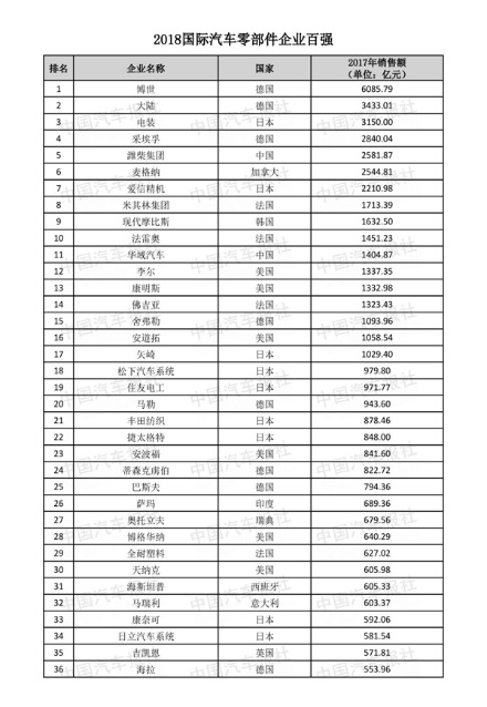 在2018国际百强榜单中,千亿元级企业有17家,入选最低年营收额为131.34亿元。榜单中,德国、日本、美国零部件企业排位靠前,是国际百强榜单中的主流企业,但仍有18家中国汽车零部件企业入选。这些中国企业代表了中国汽车零部件产业的先进力量,体现了中国自主零部件企业的实力。